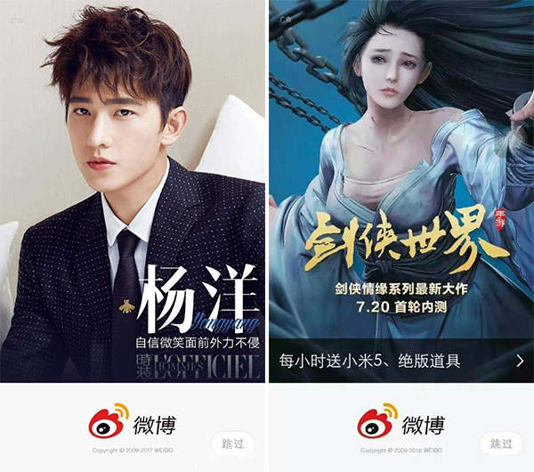 微博開屏廣告形式有開屏靜態(tài)版和開屏互動(dòng)版,也可以帶鏈接跳轉(zhuǎn)到其他網(wǎng)站,因此吸引了大量的明星和企業(yè)做品牌宣傳。