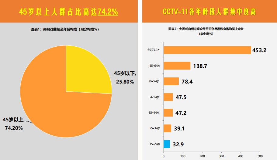 帶動(dòng)頻道收視上揚(yáng),傳播效果更優(yōu)!CCTV-11改版后,全天各時(shí)段收視份額上漲明顯。45歲以上中老年受眾居多,觀眾忠實(shí)度高,粘性強(qiáng)。