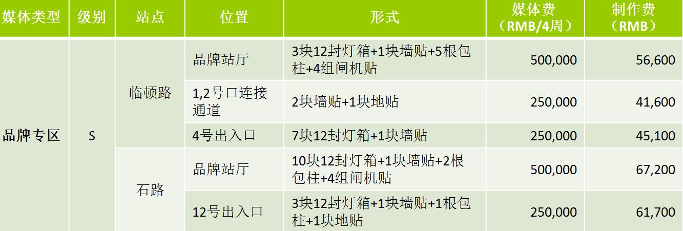 | 地鐵12封燈箱加安全門貼 媒體類型 站臺12封燈箱三聯裝加屏蔽門貼 S:媒體費(RMB/4周/站):220,000元 A++:媒體費(RMB/4周/站):160,000 A+:媒體費(RMB/4周/站):120,000 12封燈箱每塊950元,屏蔽門貼面積根據所選廣告發(fā)布位置的實際面積計算制作費 |