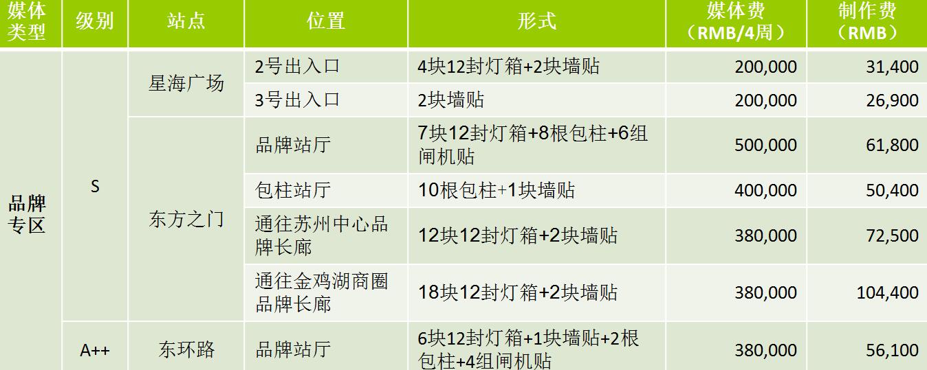 | 蘇州地鐵12封燈箱 級別 S:媒體費(RMB/4周/站) 72,000元 A++:媒體費(RMB/4周/站)58000元 A+:媒體費(RMB/4周/站)35000元 A:媒體費(RMB/4周/站)28000元 制作費:950元 ? |