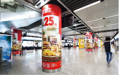 | 創(chuàng)意媒體-南京地鐵天印大道站社區(qū)站廣告 線路:1號線 組合形式 :站廳包柱4根(柱貼12面)+玻璃貼39塊 媒體費(元/4周):180,000 制作方式:寫真噴繪 制作費(元/次):20,550 |
