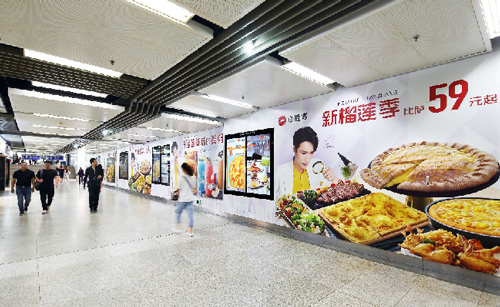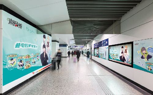| 創(chuàng)意媒體-南京地鐵雞鳴寺站品牌長廊廣告 線路:3號線 組合形式:9塊12封燈箱+109㎡墻貼 媒體費(元/52周):500,000 制作方式:UV寫真燈片+寫真噴繪 制作費(元/次):41,700 |