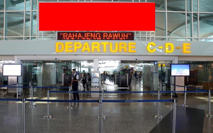 Placed on top of International Departure Entrance A-B, Facing incoming passengers from drop off point heading to Departure check-in area, this open public sites also can be seen by other airport visitors that roaming around this area for shopping or take a coffee /meal here.