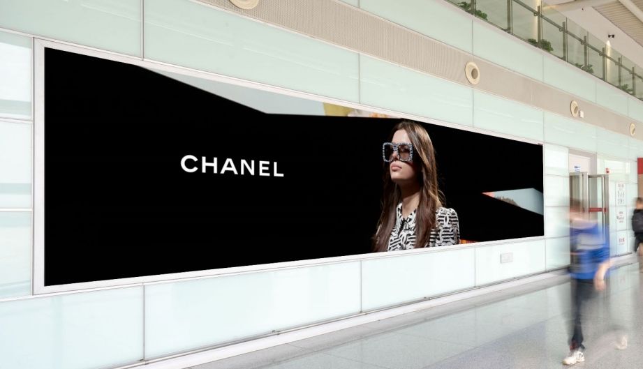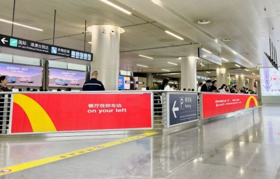 媒體位于 T2 出發(fā)層,設(shè)置在磁浮地鐵接駁連廊玻璃墻上方,直面國內(nèi)安檢 A 口客群、 從機場到地鐵磁浮的換乘客群。單塊媒體尺寸規(guī)格大,架設(shè)位置高,視野穿透力強, 廣告內(nèi)容受眾時間長,具有很好的的展示效果。