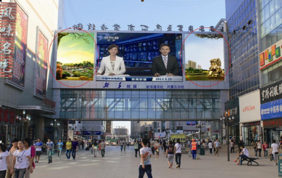 廣告描述:此廣告屏幕位于包百步行街南端人流了密集、附近包百商圈中心位置,屏幕下方為包頭最大夜市集中地。附近有包百、王府井、維多利、金榮服裝城、國美電器、蘇寧電器、為一購物、榮資商廈、狗不理美食、地下商場、包百地下小吃城、新華書店等。合作客戶達300多家均為品牌客戶。