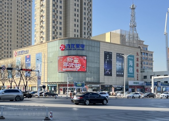 大屏位于濟寧金宇路與琵琶山路交匯處西南角九龍家電商城樓體,處于濟寧市第二商圈位置,周邊有紅星美凱龍、永旺購物中心、貴和商城、金宇家具等商場。