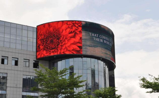 LED異型屏也開始運(yùn)用至樓宇外墻LED廣告中。樓宇拐角處“LED曲面屏”的處理方式,可以擴(kuò)大廣告的可視角度,兼顧到兩個方向的受眾視角。