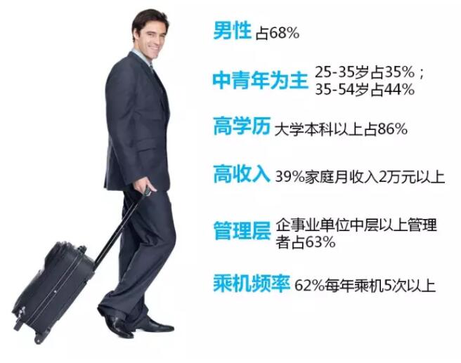 中高端商旅群體是航空人群的主力群體,這為中高端品牌準(zhǔn)確有效覆蓋目標(biāo)客戶(hù)提供了便利的媒體渠道。調(diào)研顯示,航空人群整體特征偏向于中青年高學(xué)歷已婚群體,職位以企事業(yè)中高層管理者為主,具有較高的收入水平,消費(fèi)能力強(qiáng),注重生活品質(zhì)。
