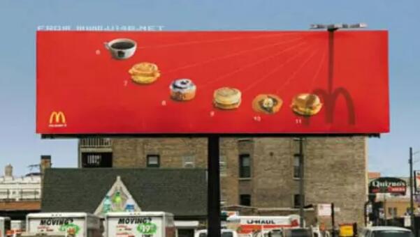 麥當(dāng)勞是芝加哥的快餐一哥,在麥當(dāng)勞打出的廣告里,最讓人有深刻印象的就是一個個性十足的大型時鐘廣告牌“日晷”,麥當(dāng)勞在街道的一屋頂上設(shè)計了一個大型的時鐘,在12個小時刻鐘上分別放置了代表每一個時間點(diǎn)的麥當(dāng)勞典型快餐,這樣的圖案效果,讓人在每一個時間都能想到麥當(dāng)勞,廣告的宣傳效果非常突出。