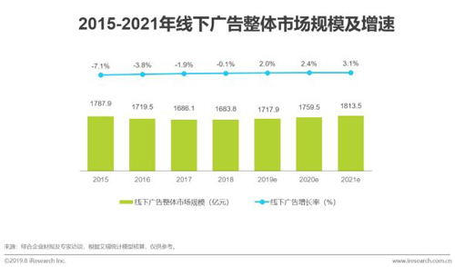 中國線下廣告因受到互聯(lián)網(wǎng)沖擊,整體規(guī)模在2015-2018年間呈現(xiàn)負(fù)增長趨勢,從1787.9億元跌落到1683.8億元。預(yù)計從2019年起,線下廣告整體規(guī)模將從負(fù)增長回復(fù)至正增長,且增長率將逐年提升。