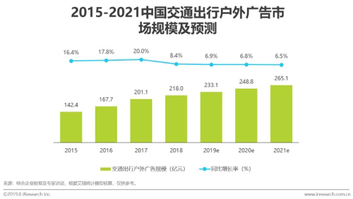 根據(jù)艾瑞咨詢數(shù)據(jù)顯示,2018年中國交通出行場景戶外廣告市場規(guī)模達218億元,同比增長率為8.4%。艾瑞分析認(rèn)為,未來交通出行中戶外廣告的發(fā)展穩(wěn)定。一方面是因為交通場所建設(shè)和人流量都有著穩(wěn)定的規(guī)劃和控制,且交通場所的商業(yè)化滲透率也較為飽和,因此從供給和需求上都不會產(chǎn)生大的變化;另一方面,由于交通場所的公共安全屬性,難以出現(xiàn)通過增加單位場所內(nèi)的廣告資源類型或數(shù)量來實現(xiàn)新的增長。