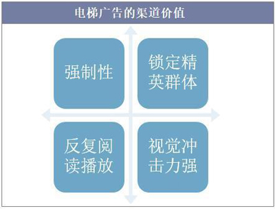 與電視廣告和網(wǎng)絡(luò)廣告相比,電梯廣告具有一定的強制性,用戶可以在乘坐電梯期間同時觀看框架和視頻的廣告信息,視覺沖擊力較強。同時,電梯廣告費用低廉,可反復(fù)閱讀,能傳遞更多的信息。此外,城區(qū)中高檔的商住樓里集中了城市主力消費群體,電梯廣告的目標(biāo)性較強,能快速鎖定精英群體。