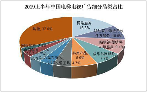 從電梯電視廣告來看,2019年上半年中國電梯電視廣告細(xì)分品類占比最大的為網(wǎng)絡(luò)服務(wù),占比達16.6%,其次為移動客戶端應(yīng)用軟件及服務(wù),占比10%,照相館/婚紗照/沖印服務(wù)占比為9.1%,排名第三,娛樂休閑服務(wù)和奶粉產(chǎn)品分別占比7.7%、6.9%,排名第四、五位。