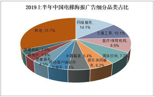 從電梯海報廣告細(xì)分品類占比情況來看,其中2019年上半年中國電梯海報廣告細(xì)分品類中占比最大的仍為網(wǎng)絡(luò)服務(wù),與電梯電視廣告相同,而第二、三名則分別為交通工具、醫(yī)療/保薦機構(gòu),占比10.1%、8.9%,移動客戶端應(yīng)用軟件及服務(wù)占比5.1%,排到第七位。