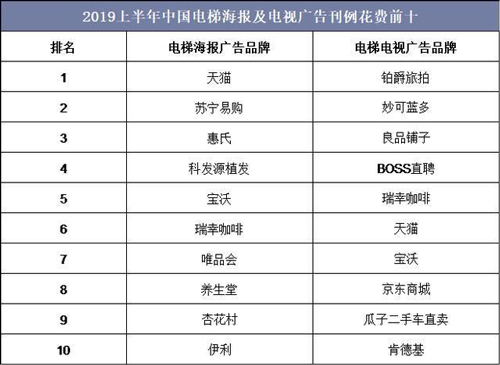 2019年上半年中國電梯海報廣告刊例花費放緩,但食品、飲料等行業(yè)的花費增長顯著,其中電梯海報廣告排名前五大的品牌分別為天貓、蘇寧易購、惠氏、科發(fā)源植發(fā)和寶沃。電梯電視廣告媒體高度依賴頭部品牌,其中2019年上半年排名前五大的品牌分別為鉑爵旅拍、妙可藍多、良品鋪子、BOSS直聘和瑞幸咖啡。