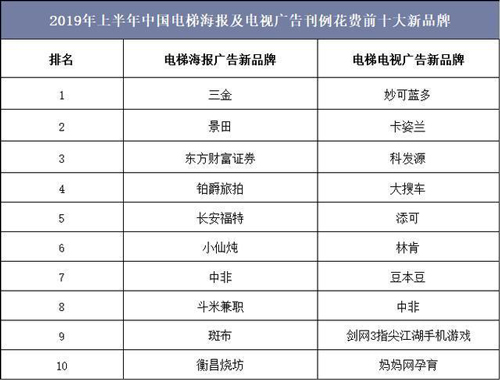 隨著傳統(tǒng)品牌廣告主對電梯廣告媒體的認(rèn)可度逐漸提升,電梯電視/電梯海報新品牌數(shù)量大幅增長,2019年上半年中國電梯海報廣告刊例花費前五大新品牌分別為三金、景田、東方財富證券、鉑爵旅拍和長安福特,電梯電視廣告刊例花費前五大新品牌分別為妙可藍多、卡姿蘭、科發(fā)源、大搜車和添可。