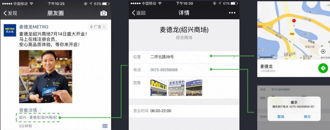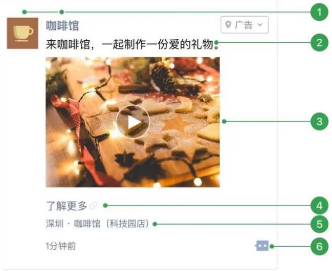3. 外層小視頻:時(shí)長(zhǎng) 6~15秒 的小視頻,視頻比例為 4:3或16:9;4.文字鏈;5.門店標(biāo)識(shí)(有線下門店可選擇展示);6.用戶社交互動(dòng)。