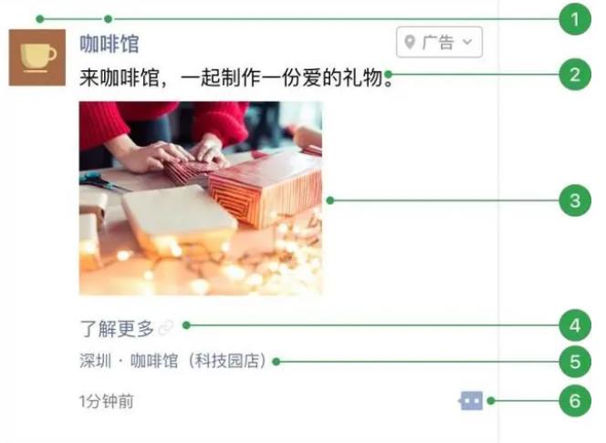 2. 外層文案;3. 外層圖片;4.文字鏈;5.門店標(biāo)識(shí)(有線下門店可選擇展示);6.用戶社交互動(dòng)。