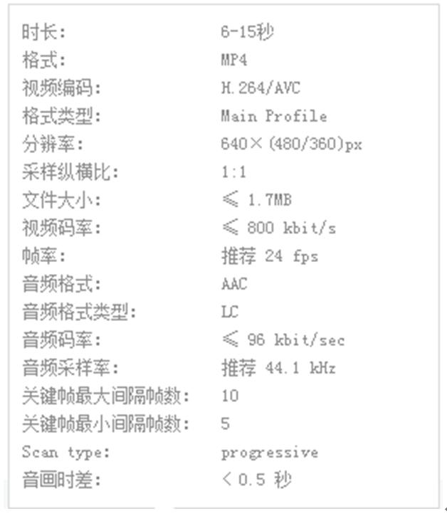 | 1、外層圖--圖片規(guī)格 此圖會同步作為朋友圈外層圖 文字占圖篇幅不超過30% 圖片格式:大小不超過300KB,不支持GIF格式 圖片尺寸:800*800像素/640*800像素/800*640像素 朋友圈展現(xiàn)形式及要求網(wǎng)址: https://ad.weixin.qq.com/landing-page-guide.html#/376 2、輪播圖--圖片規(guī)格 在投放廣告時,此圖會同步作為朋友圈外層圖 圖片格式:大小不超過300KB,不支持GIF格式 文字占比:不超過30% 圖片尺寸:800*800像素、640*960像素、640*1130像素 朋友圈形式及要求: https://ad.weixin.qq.com/landing-page-guide.html#/377 3、視頻--視頻規(guī)格 在投放廣告時,視頻會同步作為朋友圈外層視頻 視頻自動循環(huán)播放 視頻尺寸:640*480/640*360像素 視頻大小:文件大小不超過1.7MB 視頻長度:6-15秒 ? |
