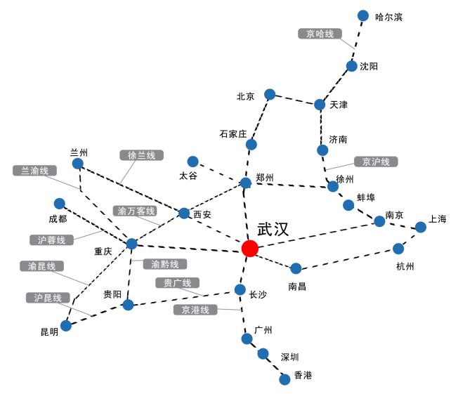 武漢有九省通衢之稱,高鐵網(wǎng)絡(luò)連接大半中國,是中國鐵路系統(tǒng)中重要的大型中轉(zhuǎn)站以及內(nèi)河重要港口,覆蓋全國主要發(fā)達省市區(qū)和湖北省內(nèi)60%的人口及80%的經(jīng)濟總量。