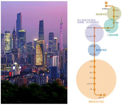 3號線 ——高端CBD線:3號線與1號線、3北線、5號線、8號線及APM線同時接軌,連接了廣州最高端的商務(wù)區(qū)(珠江新城)、最繁華的商業(yè)區(qū)(天河城)、最高檔的住宅區(qū)、最高密度的IT數(shù)碼商圈(崗頂)、以及廣州多個重點院校(華工、華師和華農(nóng)),匯集了高密度的高端素質(zhì)客流。