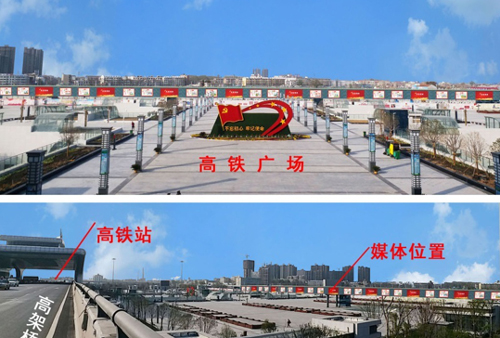 該媒體位于商丘站核心區(qū)高鐵站正對(duì)面。西有凱旋路,東有歸德路,媒體兩側(cè)緊靠車流量較多的高架橋出入口,正前方是人口密集的高鐵廣場(chǎng),交通樞紐四通八達(dá),廣告位置明顯,視覺沖擊力強(qiáng)。無論是從高架橋上、高鐵廣場(chǎng)里或者高鐵站進(jìn)出站口處,都是最顯著的媒體。