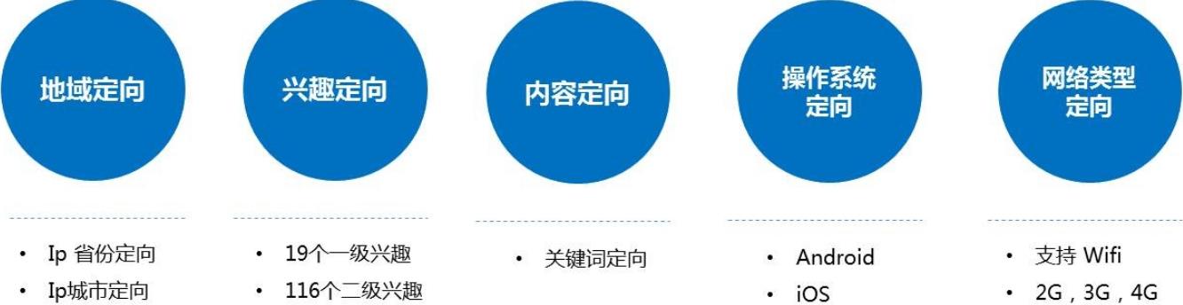 目前開放上線4個(gè)維度定向,分別是地域定向、興趣定向、內(nèi)容定向、操作系統(tǒng)定向、網(wǎng)絡(luò)類型定向,