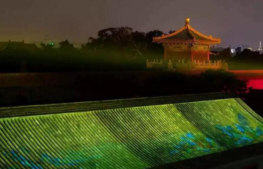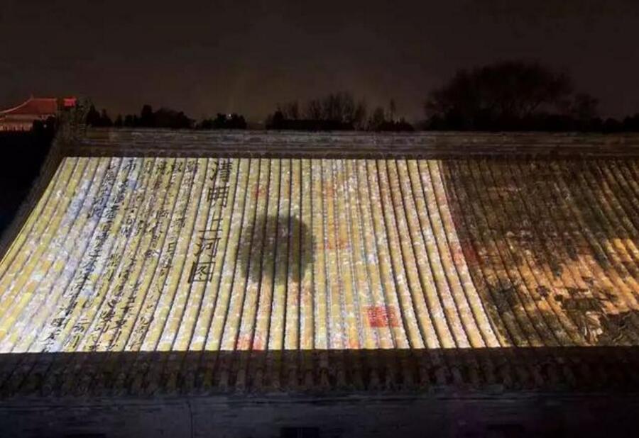 此次夜游故宮最精彩的地方,莫過(guò)于從東北角樓帶神武門的這一塊區(qū)域了。光與影將《清明上河圖》和《千里江山圖》等畫卷投影于大殿屋頂上,或如展開的折扇,或如綠色的屏障,耳邊還應(yīng)景地回蕩著叫賣、搖櫓等聲音,古畫的意境與屋瓦融為一體,靈動(dòng)異常,仿佛人在畫中游。