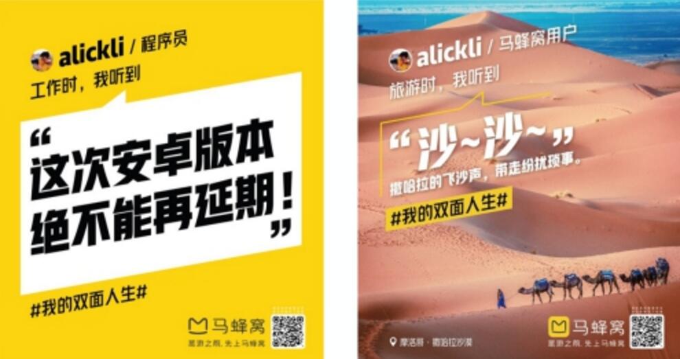 近日,北京地鐵1號線、2號線、10號線等十余條線路上,陸續(xù)出現(xiàn)了馬蜂窩旅游網(wǎng)的新版地鐵廣告。與近兩年常出現(xiàn)在人們視野中的標(biāo)志性品牌黃略有不同,這次廣告的主角是馬蜂窩的用戶們。廣告以“我的雙面人生”為主題,詮釋了當(dāng)代年輕人在工作中與旅途中展現(xiàn)出的不同自我,同時(shí)也體現(xiàn)出馬蜂窩作為一個(gè)年輕化旅游平臺的個(gè)性與多元。