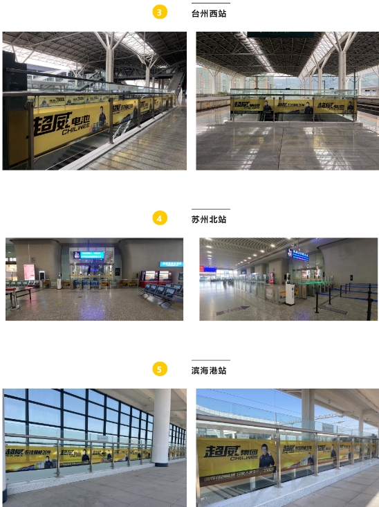 本次超威品牌投放,全面覆蓋 浙江杭州、寧波、臺州、金華、湖州,江蘇蘇州、鹽城、常熟,安徽合肥、池州、阜陽等國內(nèi)各大城市的重要樞紐站點。無論是候車廳還是站臺,隨處可見亮眼的“超威黃”。