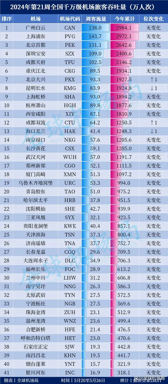 2024年第21周全國千萬級機(jī)場客流出爐!