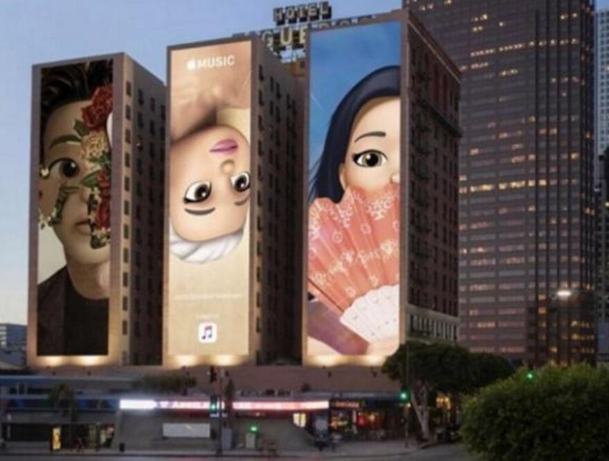 在洛杉磯著名的菲格羅亞酒店前,一套由Memoji版歌星宣傳畫組成的巨幕三聯(lián)畫布滿三棟建筑的外墻,不遠(yuǎn)處就是格萊美頒獎典禮的主會場斯臺普斯中心。三聯(lián)畫分別是由Memoji自定義表情組成的Ariana Grande、Kacey Musgraves和Shawn Mendes,頗為引人注目。