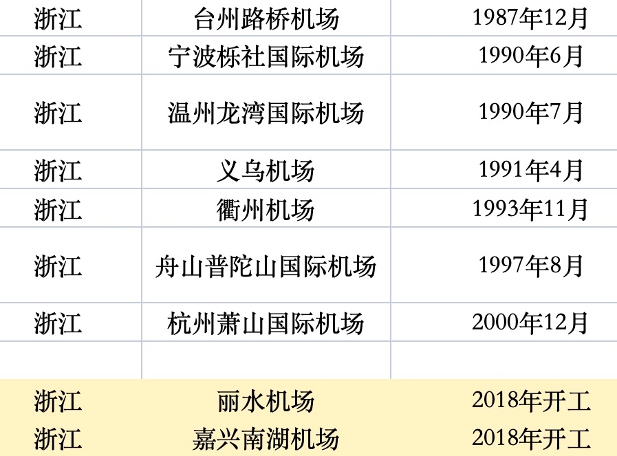 從機(jī)場(chǎng)建成通航的時(shí)間來(lái)看,上世紀(jì)90年代是高峰期。如在浙江的7個(gè)機(jī)場(chǎng)中,有5個(gè)于90年代通航,另有杭州蕭山國(guó)際機(jī)場(chǎng)在2000年12月通航。