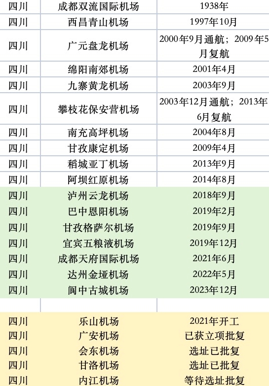 2018年以來(lái),四川已建成7個(gè)民用機(jī)場(chǎng),分別為瀘州云龍機(jī)場(chǎng)、巴中恩陽(yáng)機(jī)場(chǎng)、甘孜格薩爾機(jī)場(chǎng)、宜賓五糧液機(jī)場(chǎng)、成都天府國(guó)際機(jī)場(chǎng)、達(dá)州金埡機(jī)場(chǎng)、閬中古城機(jī)場(chǎng),平均一年建成超過(guò)一個(gè)。