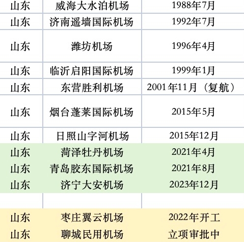 另一個(gè)經(jīng)濟(jì)大省山東,也正瘋狂建機(jī)場(chǎng)。菏澤牡丹機(jī)場(chǎng)、青島膠東國(guó)際機(jī)場(chǎng)、濟(jì)寧大安機(jī)場(chǎng)分別于2021年4月、2021年8月、2023年12月建成通航。此外,棗莊翼云機(jī)場(chǎng)已經(jīng)于2022年開(kāi)工,聊城民用機(jī)場(chǎng)項(xiàng)目也在積極推進(jìn)中,于5月剛剛進(jìn)行選址意見(jiàn)批前公示。