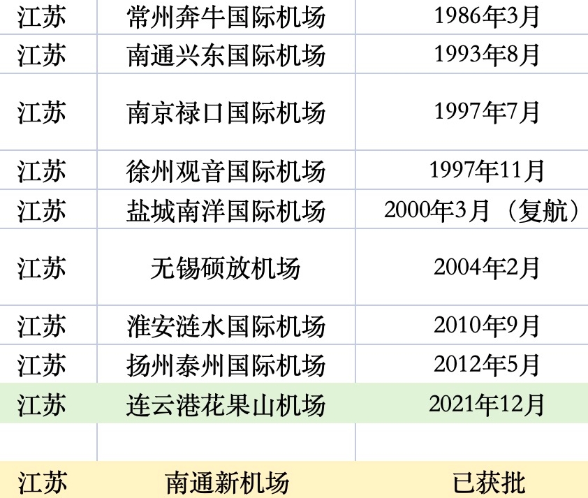 江蘇已有和在建的民用運(yùn)輸機(jī)場(chǎng)(制表:時(shí)代周報(bào)記者 王晨婷)